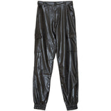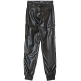Pantalon cargo pour femme de marque Sixth June. Matière en simili cuir semi-épais. Poches latérales au niveau des genoux, broderie Sixth June sur le côté gauche. Fermeture zippée et boutonnée, élastique aux chevilles, poches latérales. Coupe large. Modèle noir.