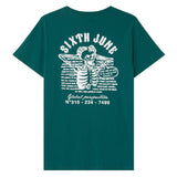 Grand imprimé à l'arrière avec un dessin de squelette se tenant la tête et textes, petit squelette imprimé à l'avant sur la poitrine.