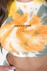 Effet tie and dye en forme de spiral avec des nuances de vert, orange, jaune et blanc. Imprimé Sixth June au centre de la poitrine en noir, matière côtelée, col rond.