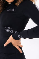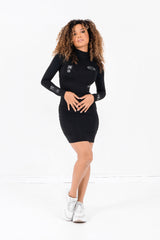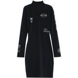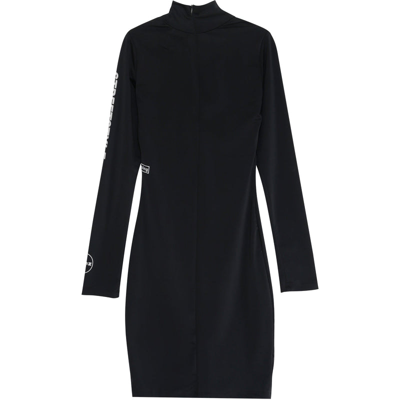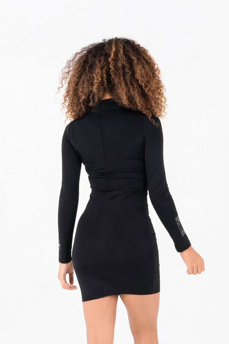Robe à manches longues pour femme de marque Sixth June. Plusieurs imprimés à l'avant et sur la manche gauche, matière lisse et soyeuse. Fermeture à zip au dos, col montant. Coupe moulante, longueur mini. Modèle noir.
