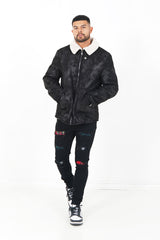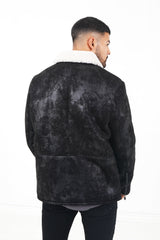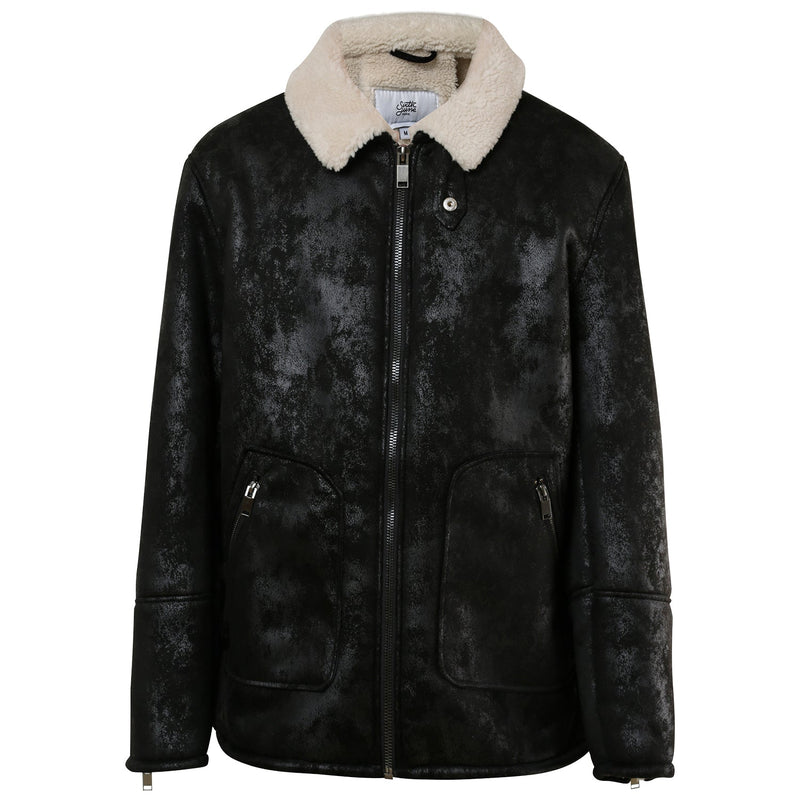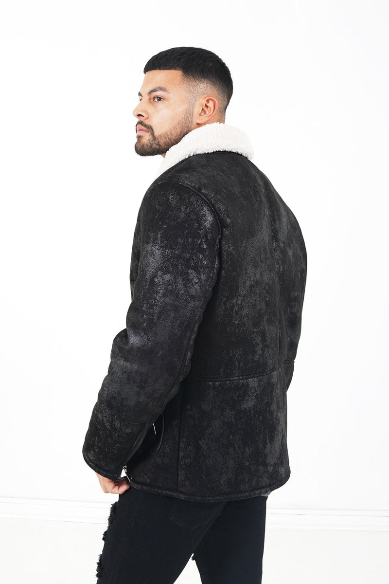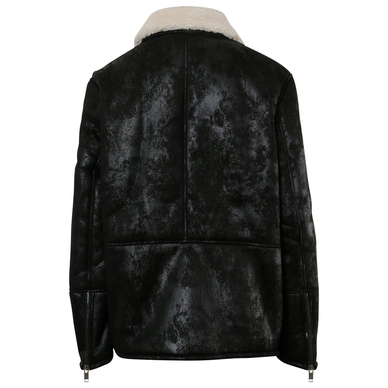 Tissus en fausse peau de mouton, col revers. Fermeture à zip au niveau des poignets et de la fermeture centrale, poches latérales avec fermeture à zip.