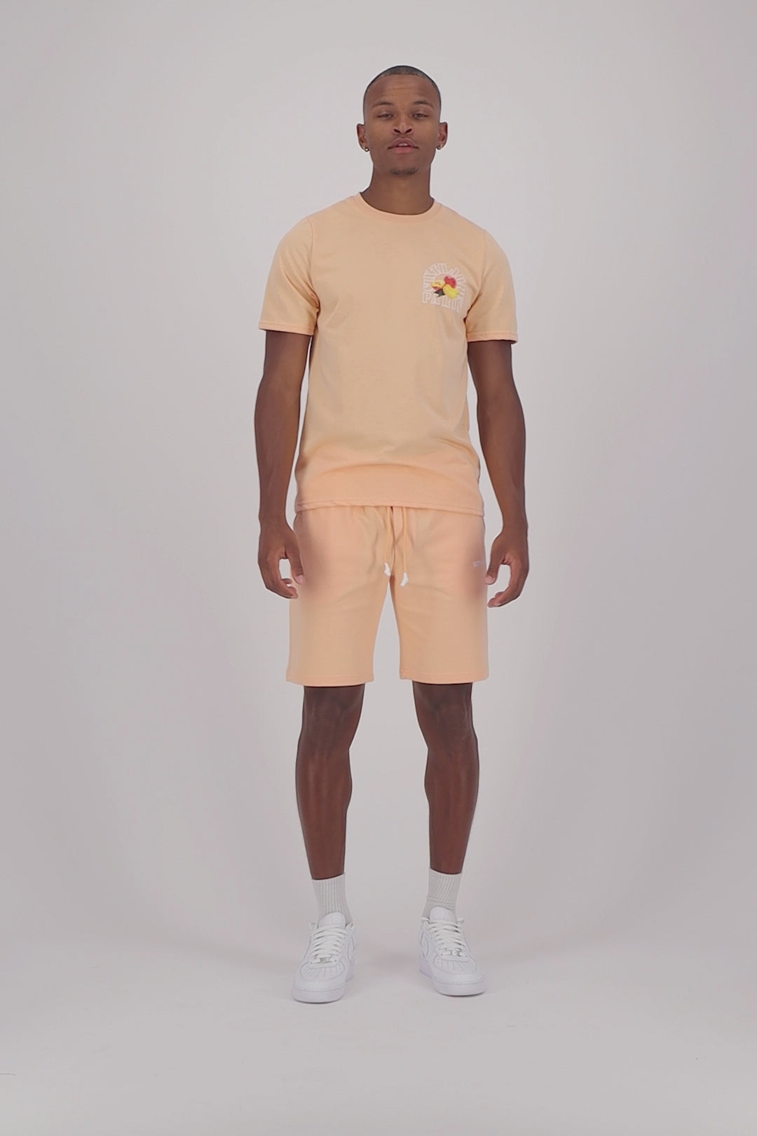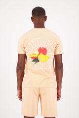 Logo imprimé avec le fruit pêche en petit à l'avant et en grand au dos.