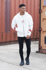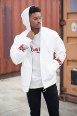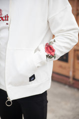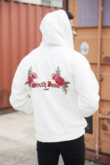Sweat à capuche homme Sixth June avec des broderies roses et logo Sixth June Paris à l'arrière et sur les manches. Coupe plus large qu'un sweat classique avec les épaules tombantes, une poche kangourou et une fermeture éclair. Modèle blanc cassé avec broderies rouge et verte.