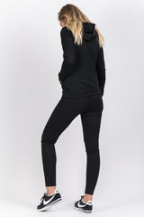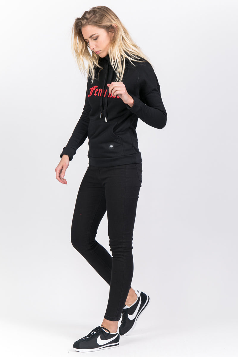 Sweat à capuche pour femme Sixth June avec un imprimé Feminist à l'avant. Coupe classique, manches longues, cordons de serrage au niveau du col et poche kangourou. Modèle noir et imprimé rouge.
