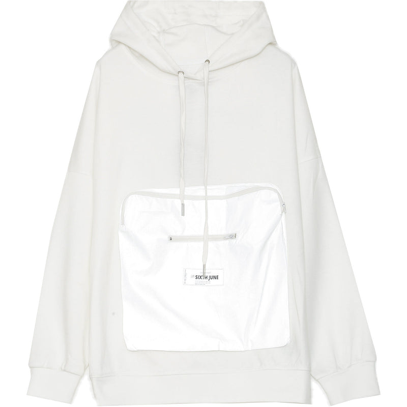 Sweat à capuche pour homme de marque Sixth June. Grande poche réfléchissante sur l'avant avec fermeture éclair. Imprimé Sixth June réfléchissant dans le dos. Coupe large, épaules tombantes. Modèle blanc.