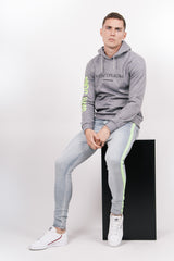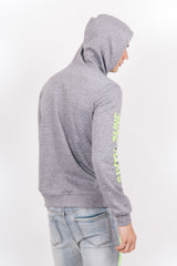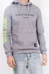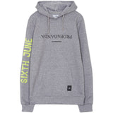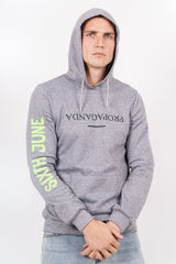 Sweat à capuche Sixth June pour homme avec Propaganda imprimé à l'envers. Coupe classique, poche kangourou, cordons de serrage, imprimé "Sixth June" sur la manche droite et tissus fin et léger. Modèle gris clair.