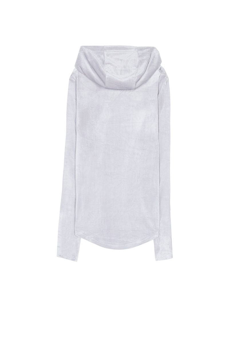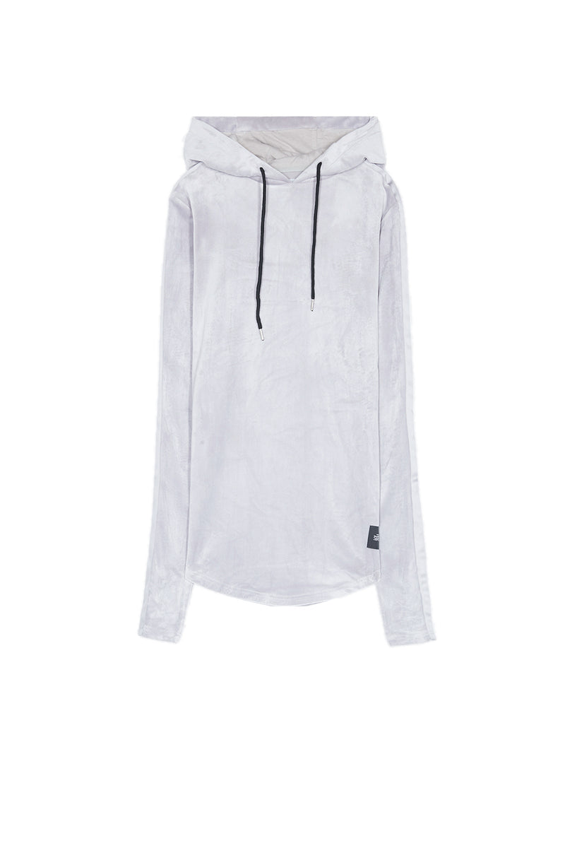 Pull Sixth June pour homme en matière velours avec une capuche et des bandes satinées le long des manches. Coupe ajustée et arrondie au niveau du bas. Modèle gris clair.
