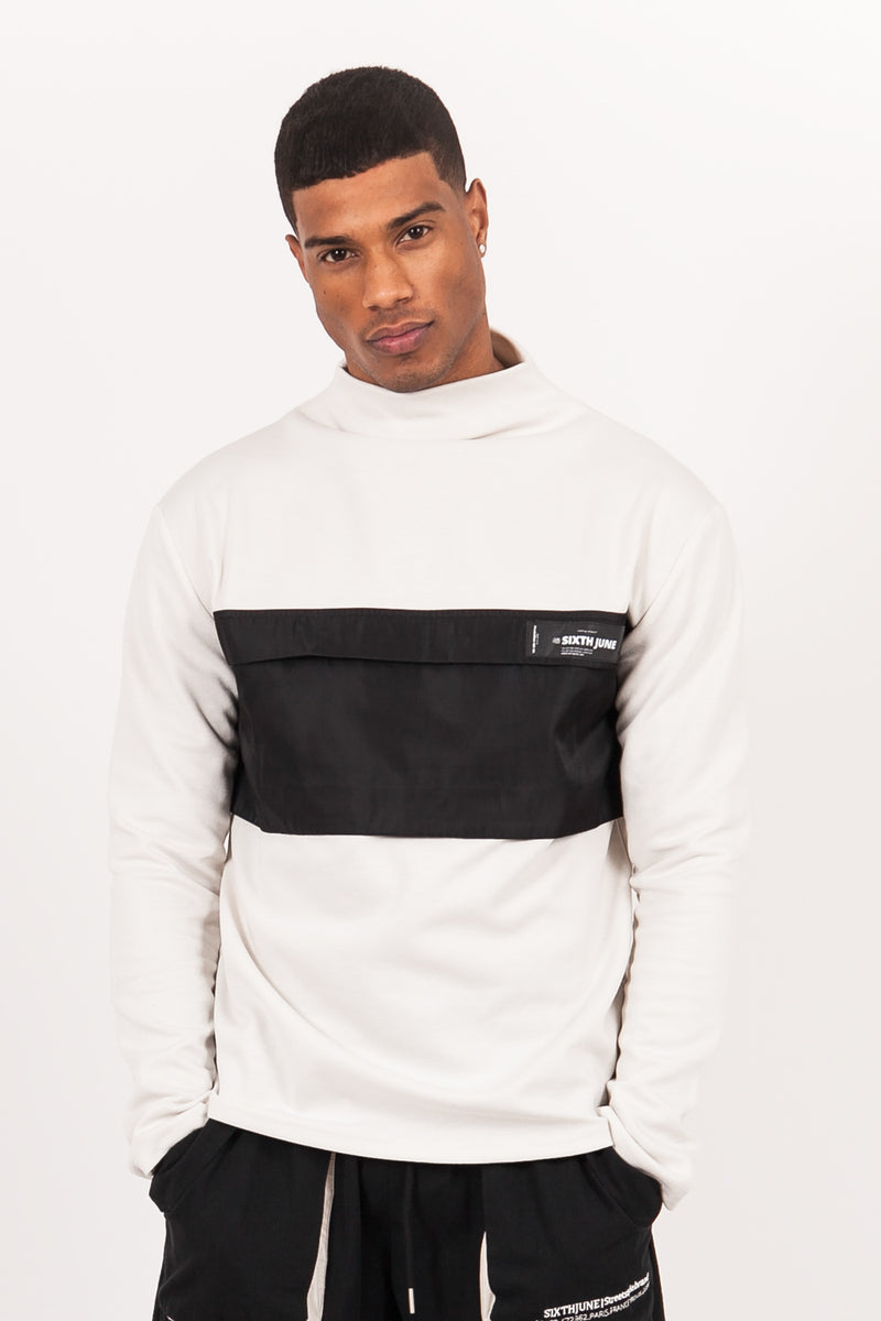 Sweat manches longues pour homme de marque Sixth June. Col montant élastique. Poche centrale en matière synthétique avec fermeture zippée, patch réfléchissant. Coupe classique. Modèle écru et noir.