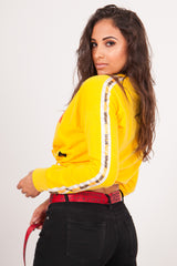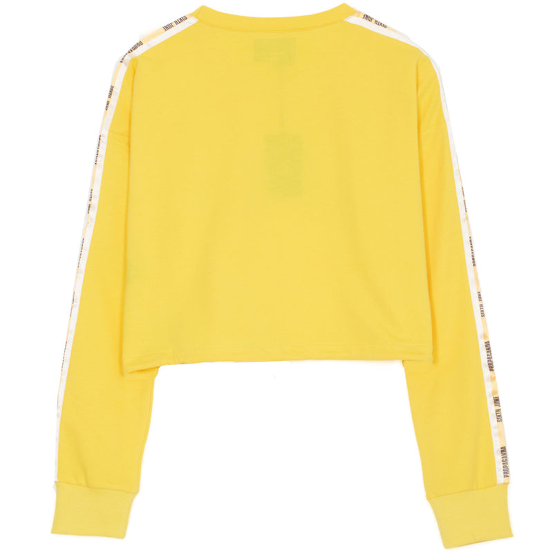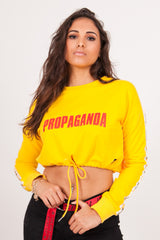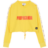 Sweat crop top Sixth June pour femme avec inscription "Propaganda" à l'avant. Coupe classique, bandes bicolores sur les manches avec "Sixth June" et "Propaganda" imprimés sur la longueur, cordons de serrage au niveau de la base et épaules tombantes. Modèle jaune avec inscription rouge.