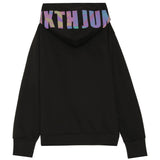 Sweat à capuche pour homme de marque Sixth June. Grand imprimé Sixth June effet pétrole réfléchissant (effet brillant à la lumière) sur la capuche. Ourlets aux manches. Coupe classique. Modèle noir.