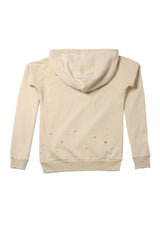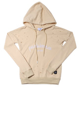 Sweat-shirt beige Sixth June Femme. Effet destroy à l'avant et à l'arrière. Inscription Parisiennes de Paris à l'avant. Capuche avec cordon de serrage. Etiquette de la marque en bas, sur le coté gauche.