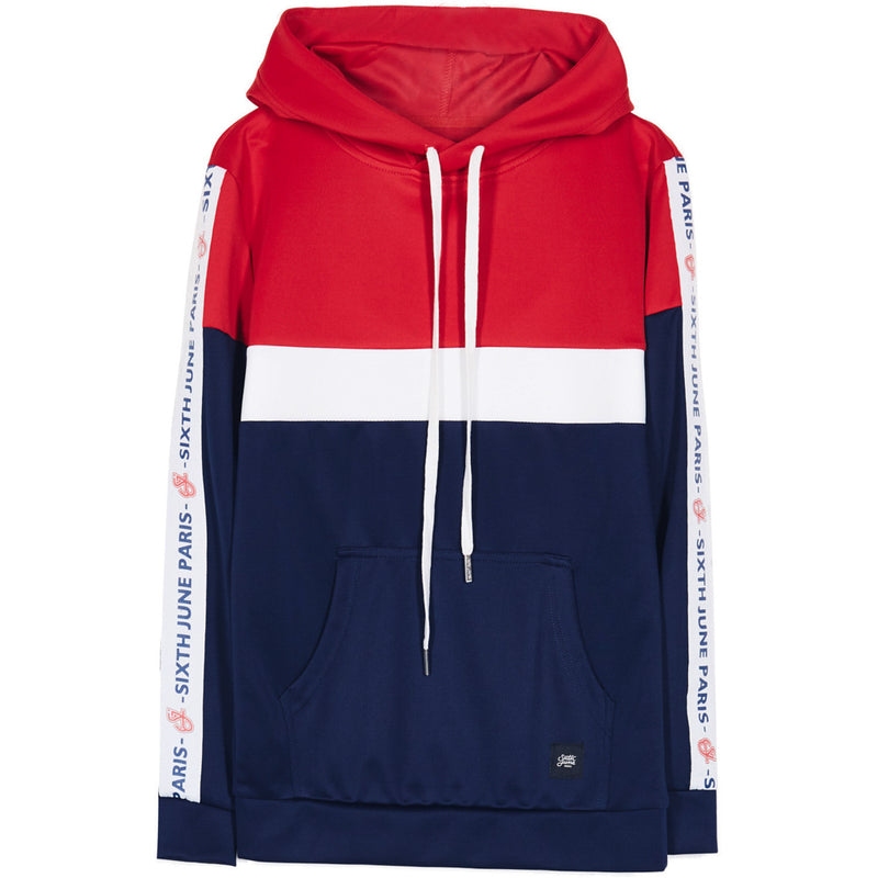 Sweat tricolore femme Sixth June avec bandes le long des manches imprimées Sixth June Paris. Coupe ajustée, capuche, poche kangourou, cordon de serrage oversize. Modèle bleu marine, rouge et blanc.