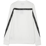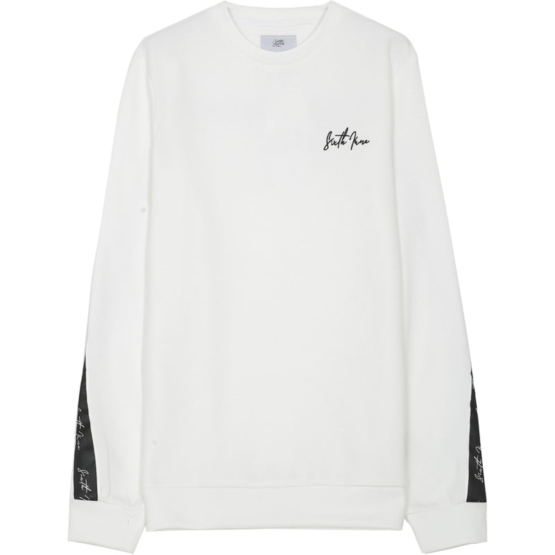 Sweatshirt Sixth June pour homme avec bande transversale dans le dos. Coupe classique, col rond, logo signature brodé à l'avant, bande transversale bicolore sur le dos et les manches avec logo Sixth June signature imprimé en continu sur la bande. Modèle blanc.