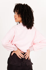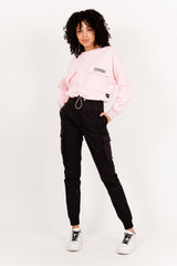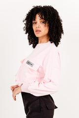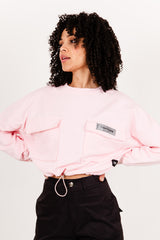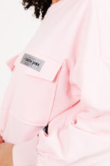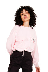 Pull col rond pour femme de marque Sixth June. Empiècement réfléchissant à l'avant gauche. Poches cargo, cordon de serrage à la base, logo Sixth June, élastiques aux poignets, légèrement resserés. Coupe classique, courte façon crop-top. Modèle rose.