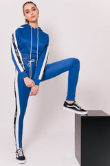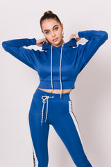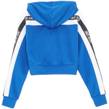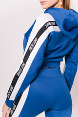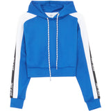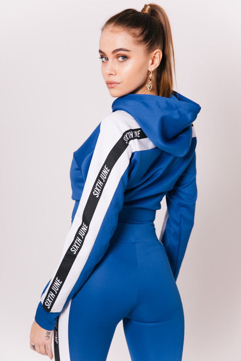 Sweatshirt court Sixth June pour femme avec bandes bicolores le long des manches. Coupe moulante, capuche avec cordons de serrage oversizes bicolores et bandes bicolores transversales à l'arrière avec "Sixth June" imprimé. Modèle bleu avec bandes noire et blanches.