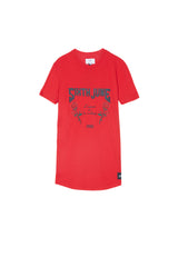 T-shirt homme Sixth June avec un imprimé à l'avant : logo métal et écriture L'amour et la violence, avec deux roses brodées. Coupe ajustée. Modèle rouge.