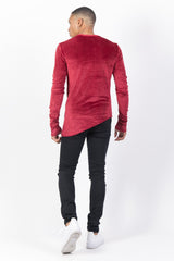 T-shirt homme Sixth June en matière effet velours ultra doux, avec deux roses brodées à l'avant. Coupe ajustée, forme asymétrique en bas et manches longues. Modèle bordeaux.