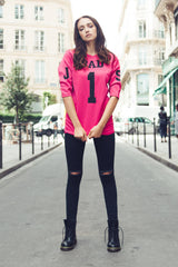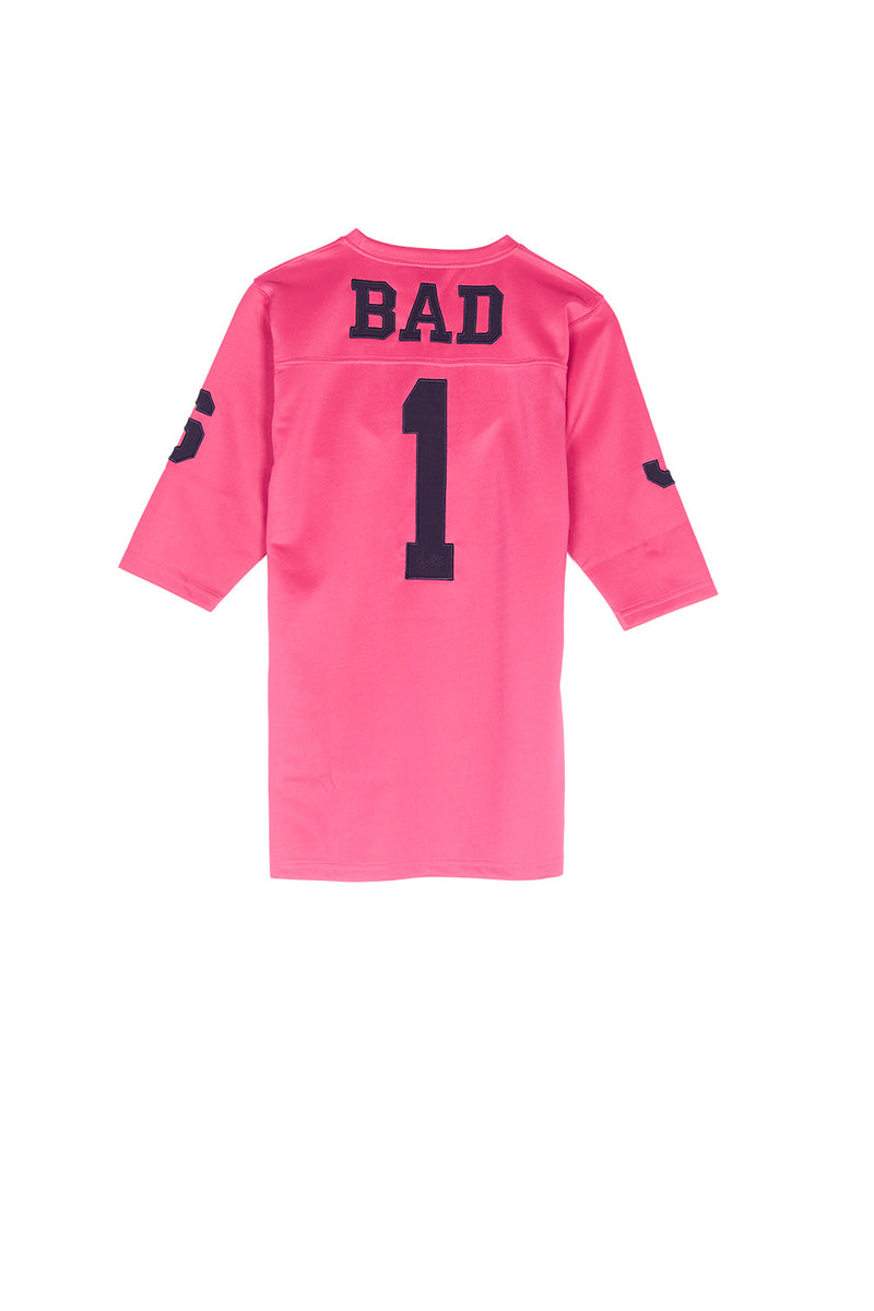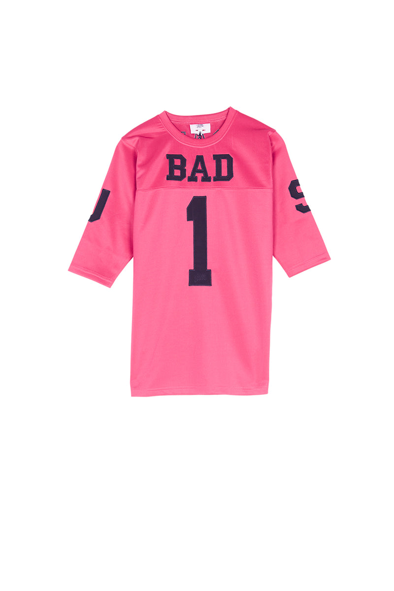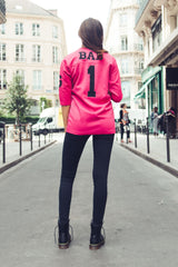 T-shirt Sixth June pour femme avec inscription BAD 1 à l'avant et à l'arrière, et S J sur les manches. Matière néoprène, coupe oversize et manches 3/4. Modèle rose framboise avec textes blancs.