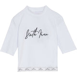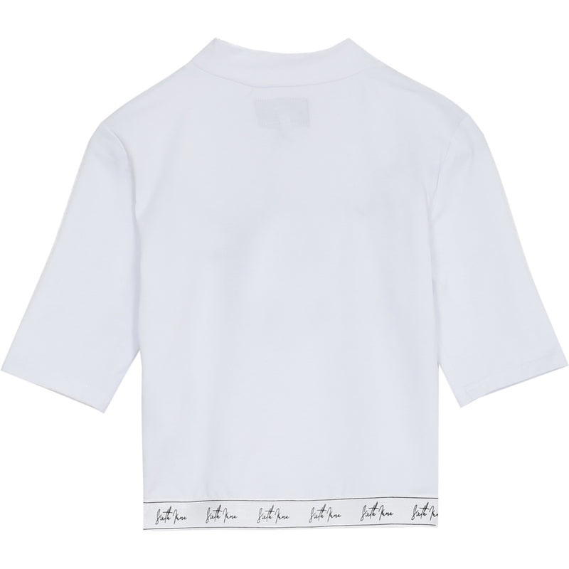 T-Shirt Sixth June pour femme style crop-top avec gros logo Sixth June signature brodé à l'avant. Coupe moulante, col montant et bande griffée. Modèle blanc.