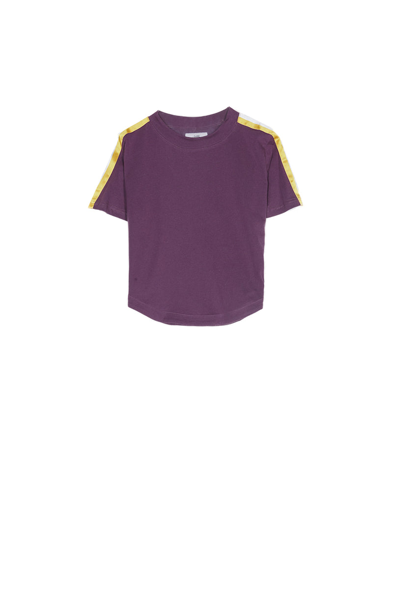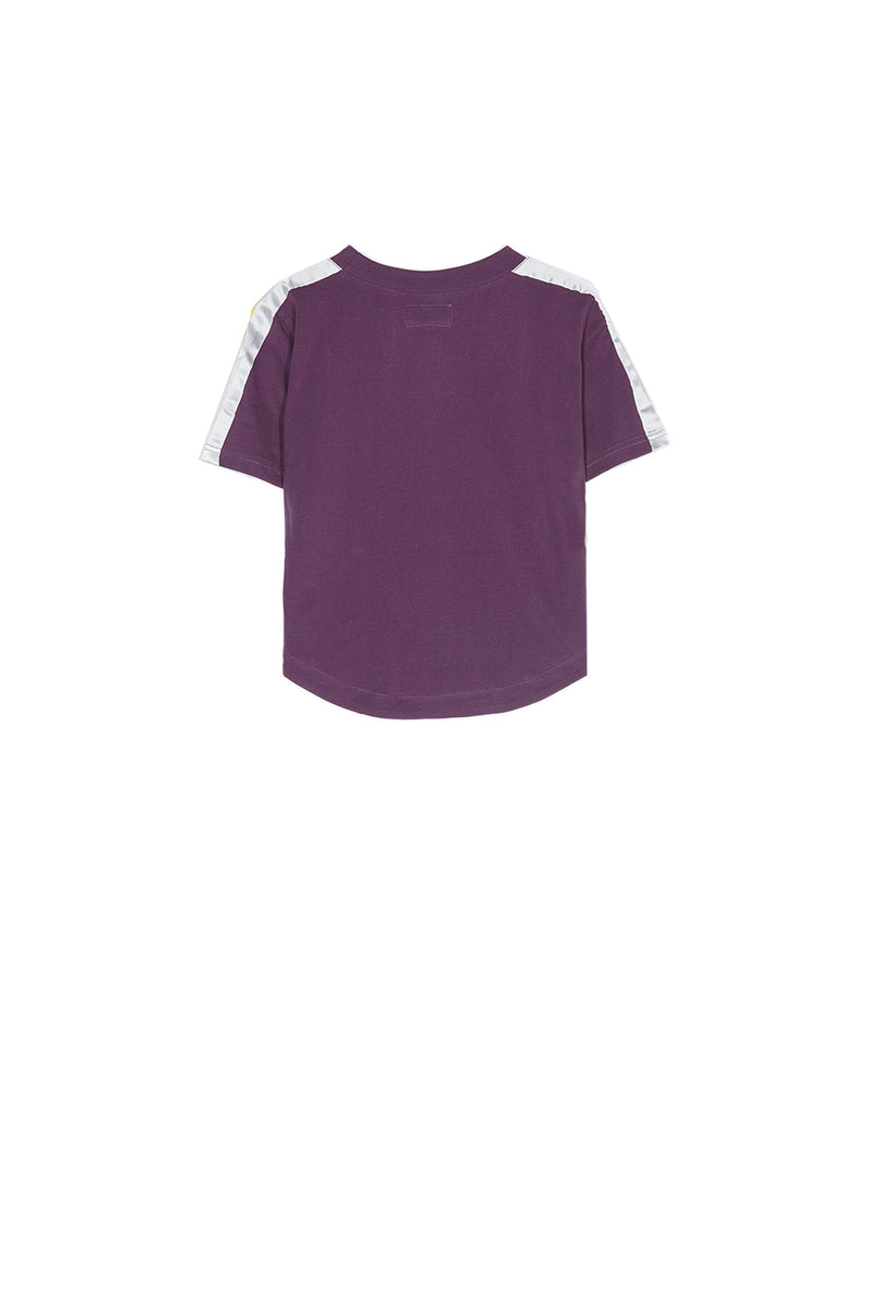 T-shirt femme Sixth June sport avec des bandes satinées sur les manches et sur les côtés. Coupe courte, col rond, manches courtes et forme arrondie en bas. Modèle violet avec bandes blanc et jaune.
