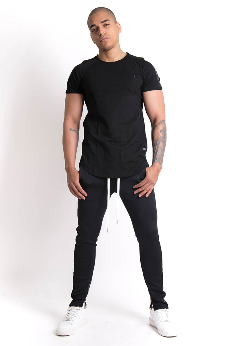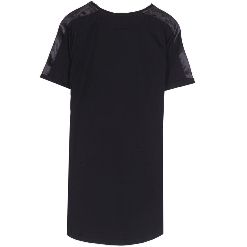 T-shirt homme Sixth June avec des bandes satinées le long des manches et une broderie SJ signature au niveau de la poitrine. Coupe classique, arrondie au niveau du bas et petit ourlet au niveau des manches. Modèle noir avec bandes blanches.