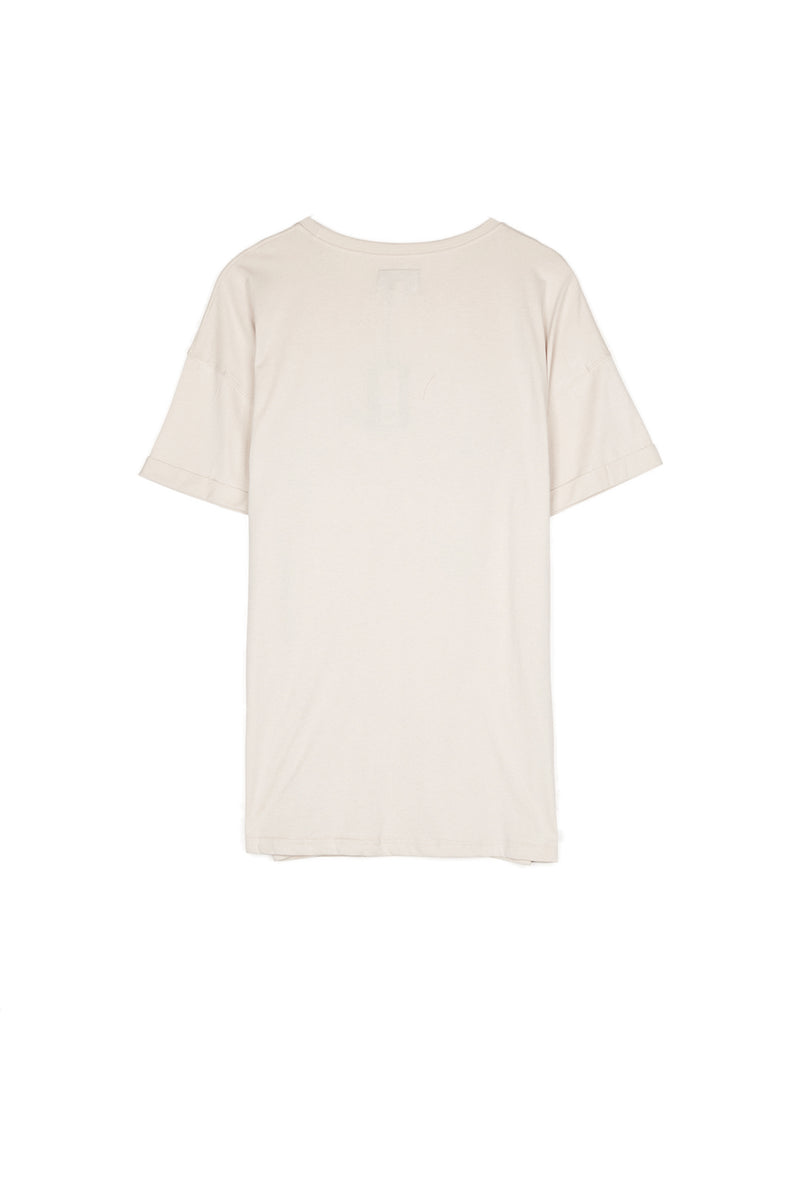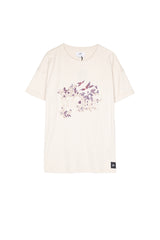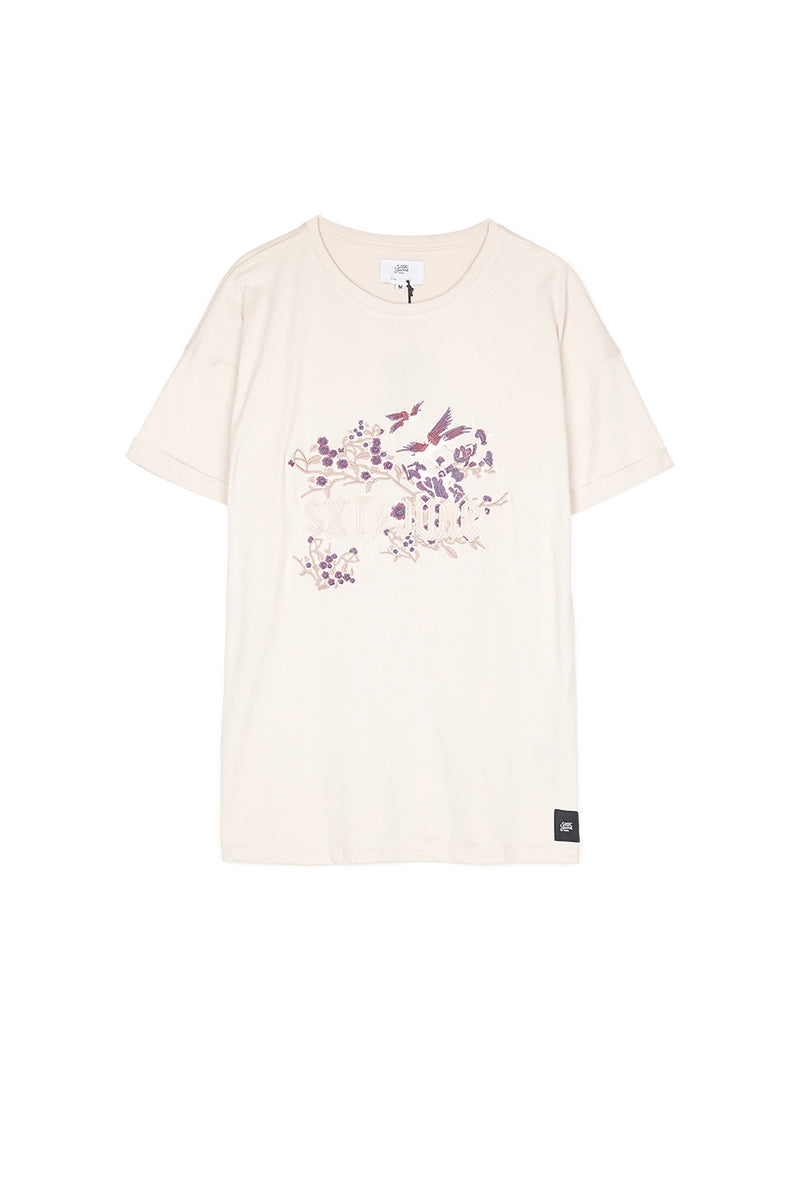 T-shirt homme Sixth June avec broderies fleurs, oiseaux et SXT JUNE à l'avant. Coupe plus large qu'un t-shirt classique, épaules tombantes et col rond. Modèle beige avec broderies colorés.