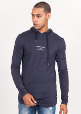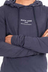 T-shirt homme Sixth June avec une capuche, des manches longues oversize, un imprimé Sixth June Paris et coordonnées GPS 48°51' 57" N,2° 20' 32" E. Coupe ajustée avec arrondi en bas, et cordons de serrage au niveau de la capuche. Modèle bleu.