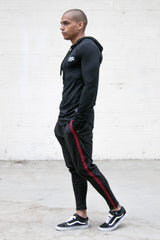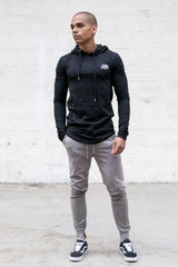 T-shirt capuche Sixth June Homme, avec une coupe moulante. Petit logo poitrine, manches longues et forme arrondie en bas. Modèle noir.