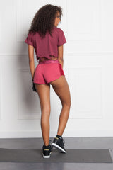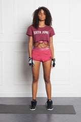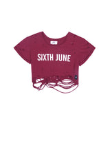 T-shirt court bordeaux Sixth June Femme. Collection Activewear. Effet destroy. Modèle crop top. Inscription Sixth June à l'avant.