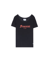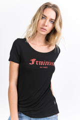 T-shirt pour femme Sixth June avec un imprimé Feminist de Paris à l'avant. Coupe classique, matière légère, col rond et manches courtes. Modèle noir et imprimé rouge.