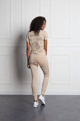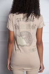 T-shirt beige Sixth June Femme. Imprimés SJ et un tigre en haut à droite. Inscriptions chinoises au dos. Effet destroy en bas.