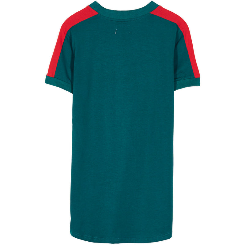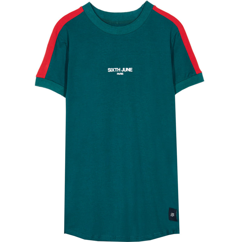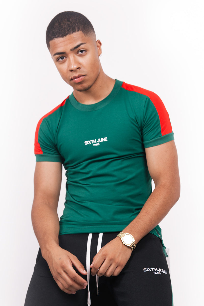 T-shirt homme Sixth June avec un logo central imprimé et une bande au niveau des épaules et des manches. Coupe moulante. Modèle vert foncé avec bandes rouges.