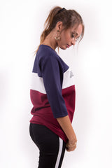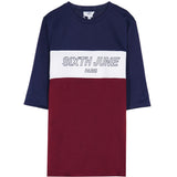 T-shirt tricolore femme Sixth June avec grand imprimé centrale Sixth June Paris. Coupe classique, taille long et manches 3/4. Modèle rouge bordeaux, bleu marine et blanc.