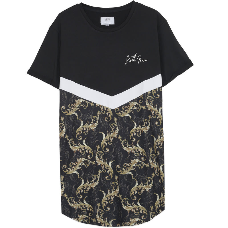 T-shirt Sixth June pour homme avec bande transversale en forme de V. Coupe large et longue, matière synthétique, logo signature imprimé, imprimé inspiration baroque et ourlets aux manches. Modèle noir, or et blanc.