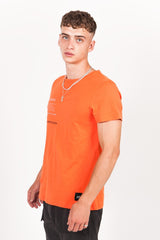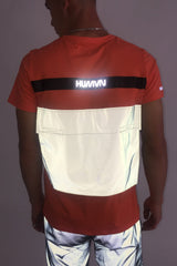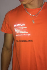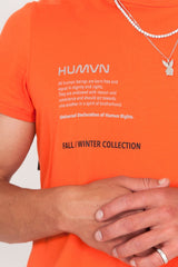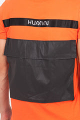 T-shirt manches courtes pour homme de marque Sixth June. Grande poche réfléchissante dans le dos et bande brodée human orange. Imprimé human à l'avant. Coupe classique. Modèle orange.