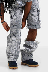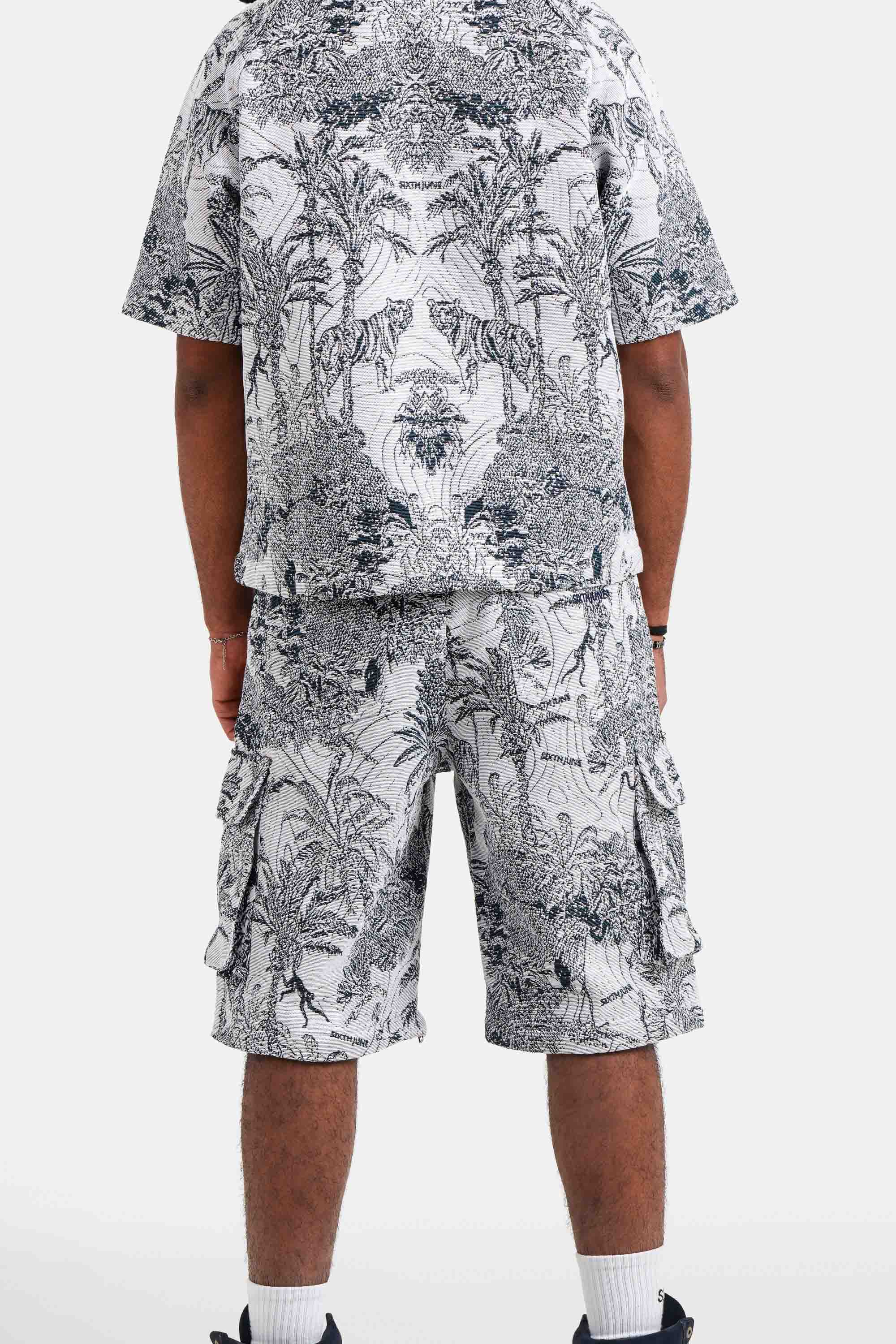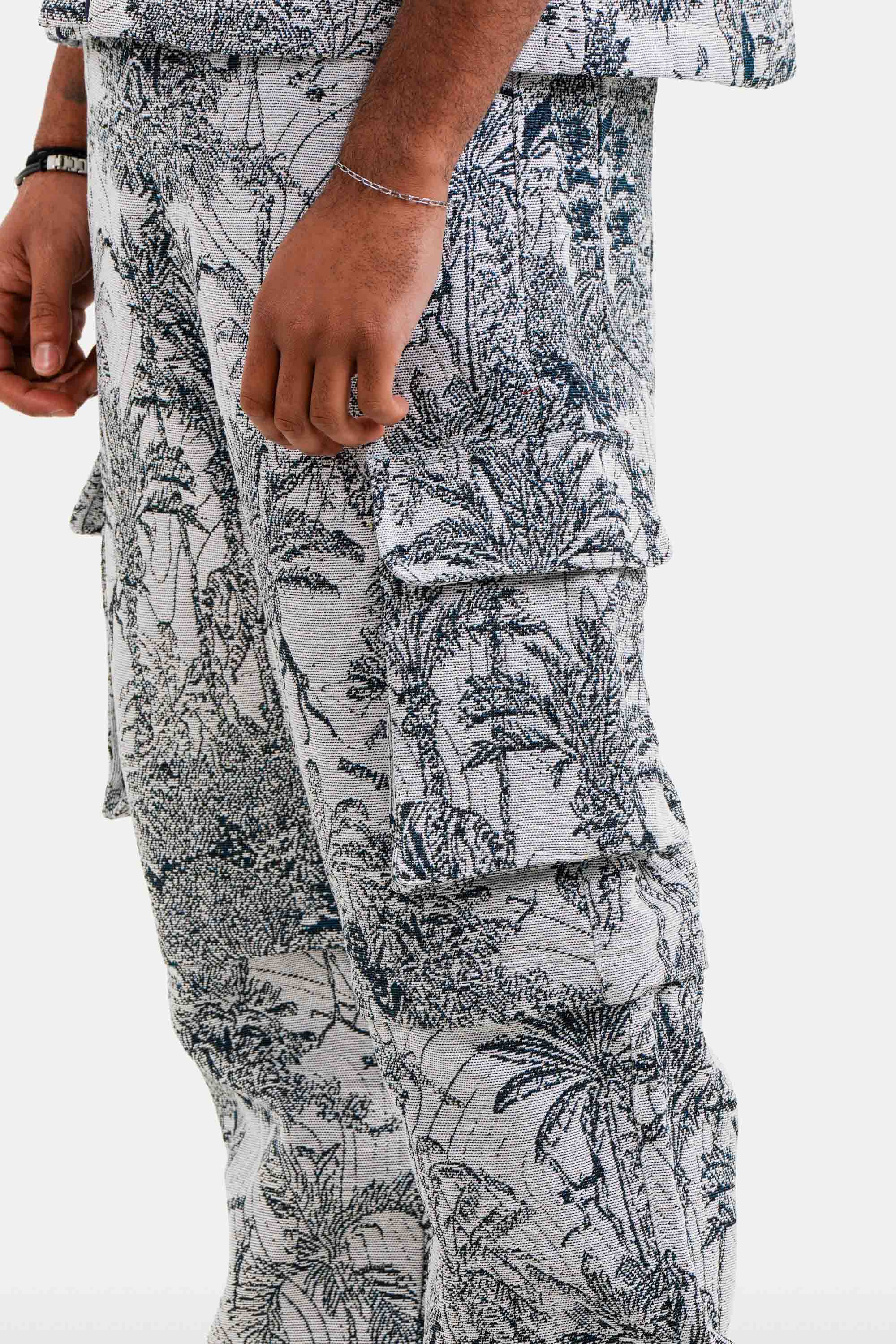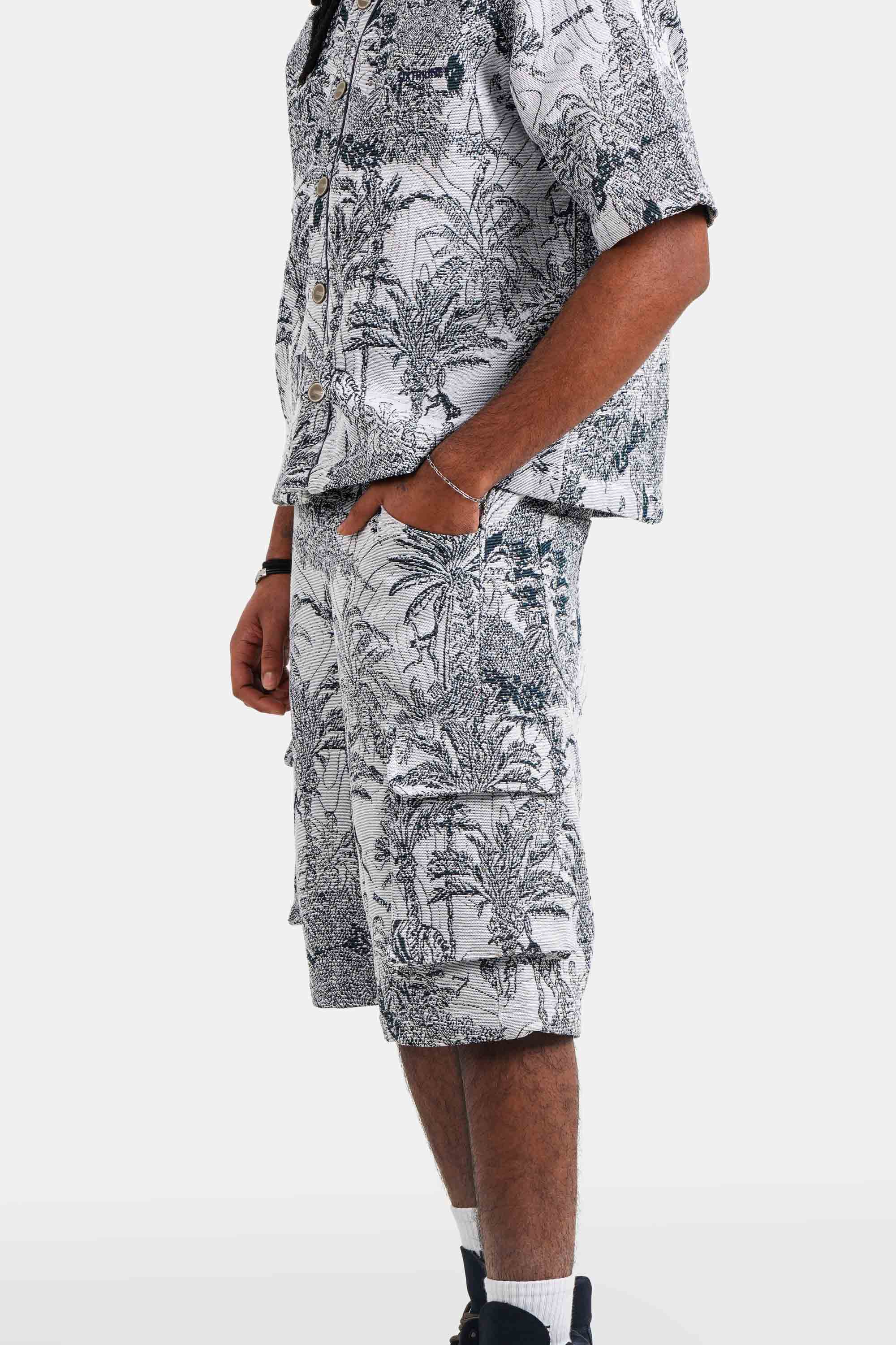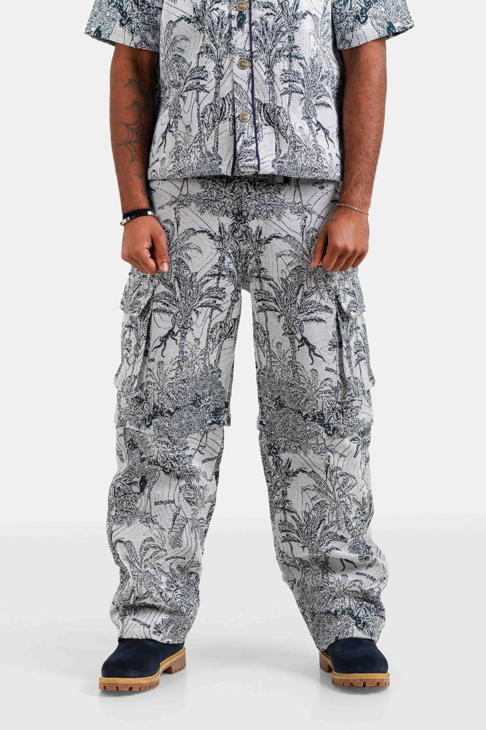 Imprimé tropical style tapisserie, tissu épais, poches cargo, poches latérales, poches à l'arrière avec logo brodé.