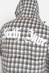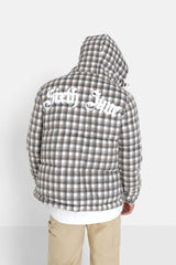 Matière duveteuse, effet matelassé, logo en patch bouclette en gros au dos, logo brodé en caractère gothique à l'avant près de la poitrine.