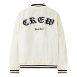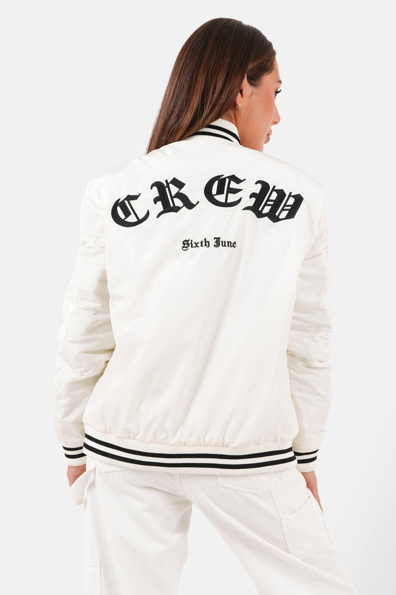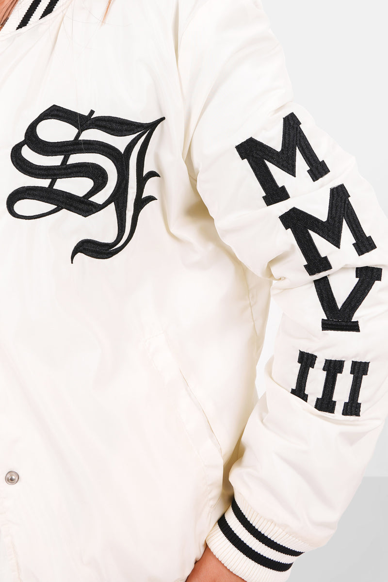 Tissu légèrement matelassé, initial SJ brodé sur la poitrine gauche, chiffres romains brodés sur la manches gauche, logo brodé sur l'avant-bras droit en caractère gothique, inscription "Crew Sixth June" brodé en grand au dos en caractère gothique également.