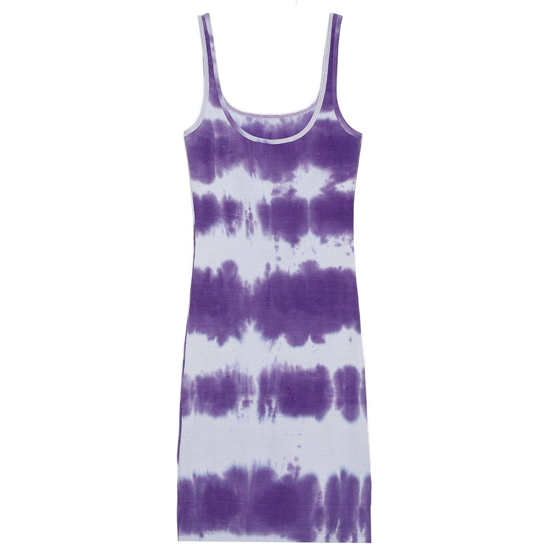Robe sans manches pour femme de marque Sixth June. Effet tie and dye avec nuances de mauve et blanc. Matière côtelée, inscription Sixth June sur la poitrine. Coupe moulante, longueur mini. Modèle violet.