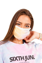 Masque mixte pour adultes. Effet tie and dye avec texte. Ce dispositif n’est ni un dispositif médical au sens du Règlement UE/2017/745 (masques chirurgicaux), ni un équipement de protection individuelle au sens du Règlement UE/2016/425 (masques filtrants de type FFP2). Coupe classique. Modèle rose clair.