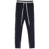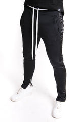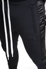 Jogging homme Sixth June avec une matière satinée, des bandes satin le long des jambes et une broderie SJ signature à l'avant. Coupe ajustée et cordons de serrage oversize, avec deux poches latérales zippées et deux poches arrière. Modèle noir avec bandes blanches.