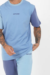 Tissu tricolore dans des tonalités de bleu. Logo inscrit à lavant, sur la poitrine.