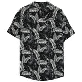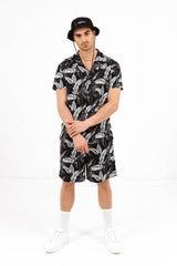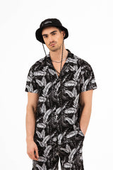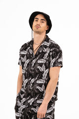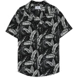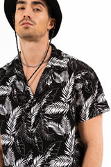 Chemise à manches courtes pour homme de marque Sixth June. Imprimé dans un esprit tropical, noir et blanc sur l'ensemble du tissu. Col à revers et dégagé, fermeture boutonnée. Coupe décontractée, tissu léger. Modèle noir.