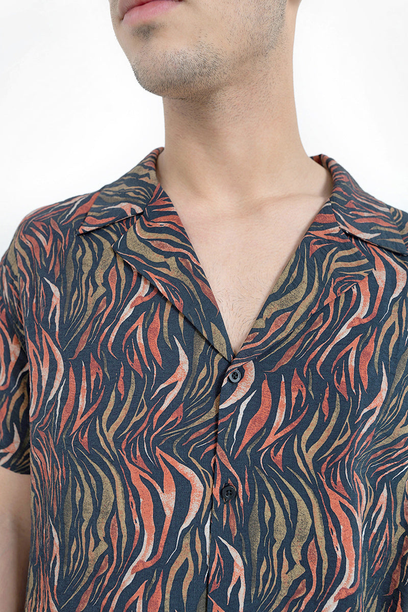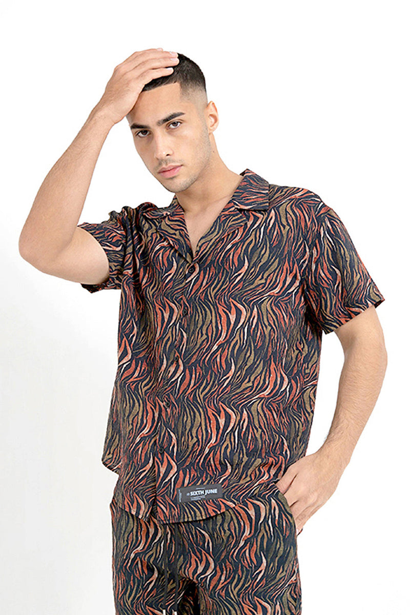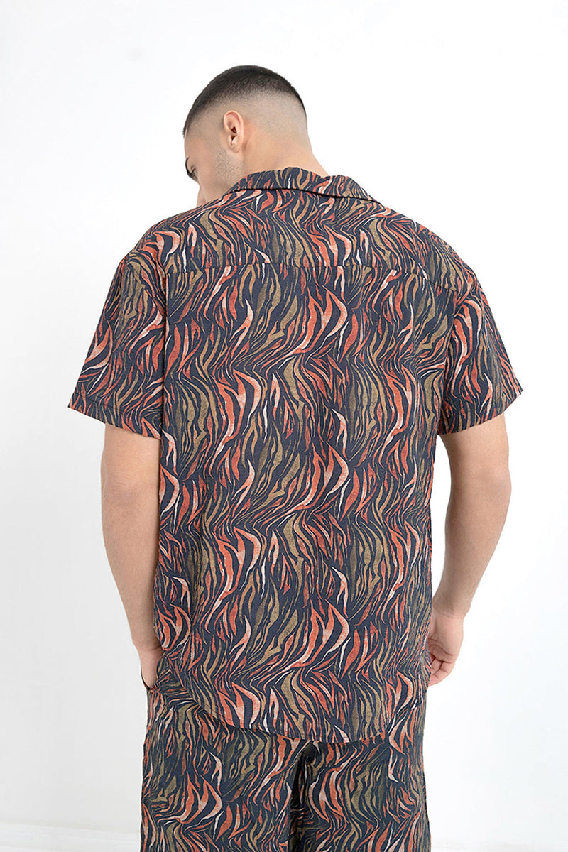 Imprimé dans un esprit savane, herbes hautes. Col à revers, fermeture à bouton, épaules tombantes.