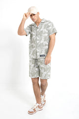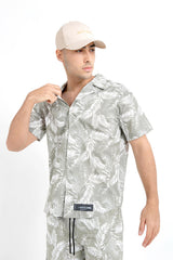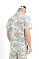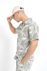 Imprimé tropical avec feuillages. Col à revers, fermeture boutonnée.