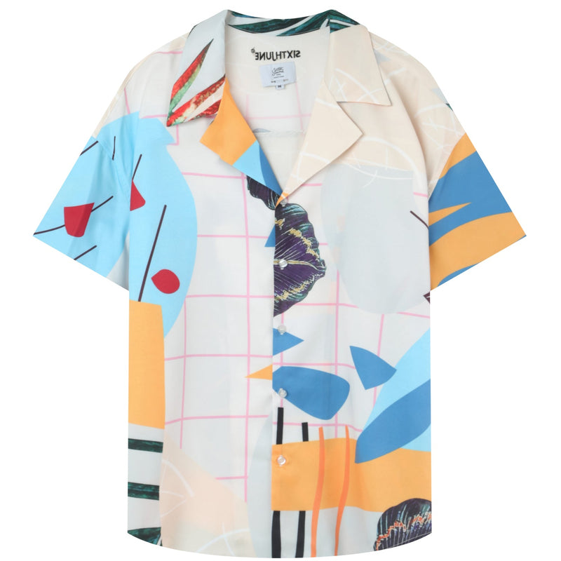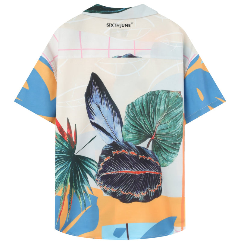 Tissu léger et fluide, imprimé tropical sur l'ensemble du tissu avec des motifs multi couleurs. Logo brodé à l'arrière au niveau de la nuque, fermeture centrale boutonnée, col à revers.