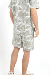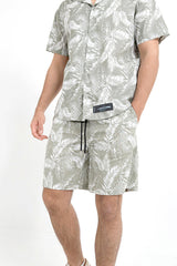 Imprimé tropical avec feuillages. Taille élastique avec cordon de serrage, poches latérales, fausse poche à l'arrière.