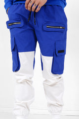 Tissu bicolore bleu et blanc, poches cargo, fausses poches à zip, poches latérales, poches arrières.