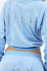 Matière très douce, effet velours, inscription Sixth June en strass et caractère gothique à l'avant près de la poitrine et dans le dos. Capuche avec cordons de serrage, fermeture centrale zippée, poignets et base côtelés.