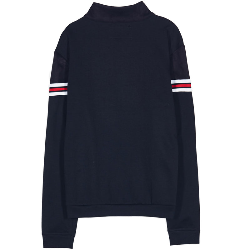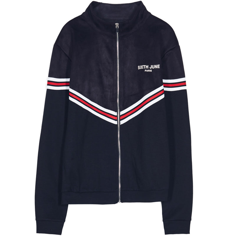 Veste homme Sixth June bi-matière en suédine et jersey avec ligne transversale en V tricolore. Logo Sixth June imprimé au niveau de la poitrine et coupe classique un peu courte en bas. Modèle noir avec bande rouge et blanc.
